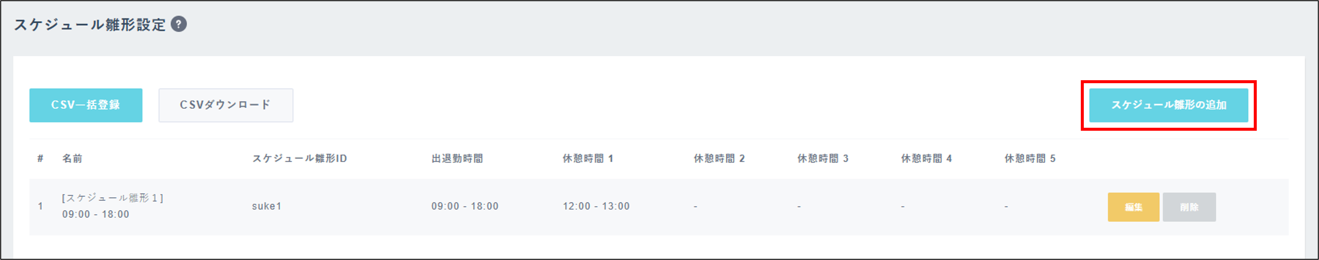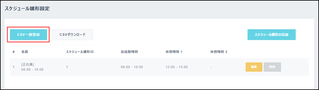 「スケジュール雛形」によって、勤務パターンのテンプレートを作成します。