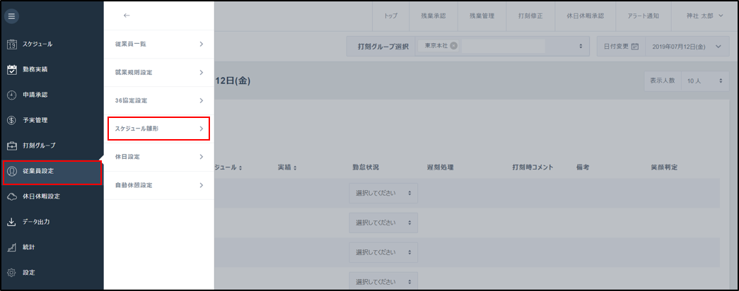 1.[従業員設定]>[スケジュール雛形]をクリックします。