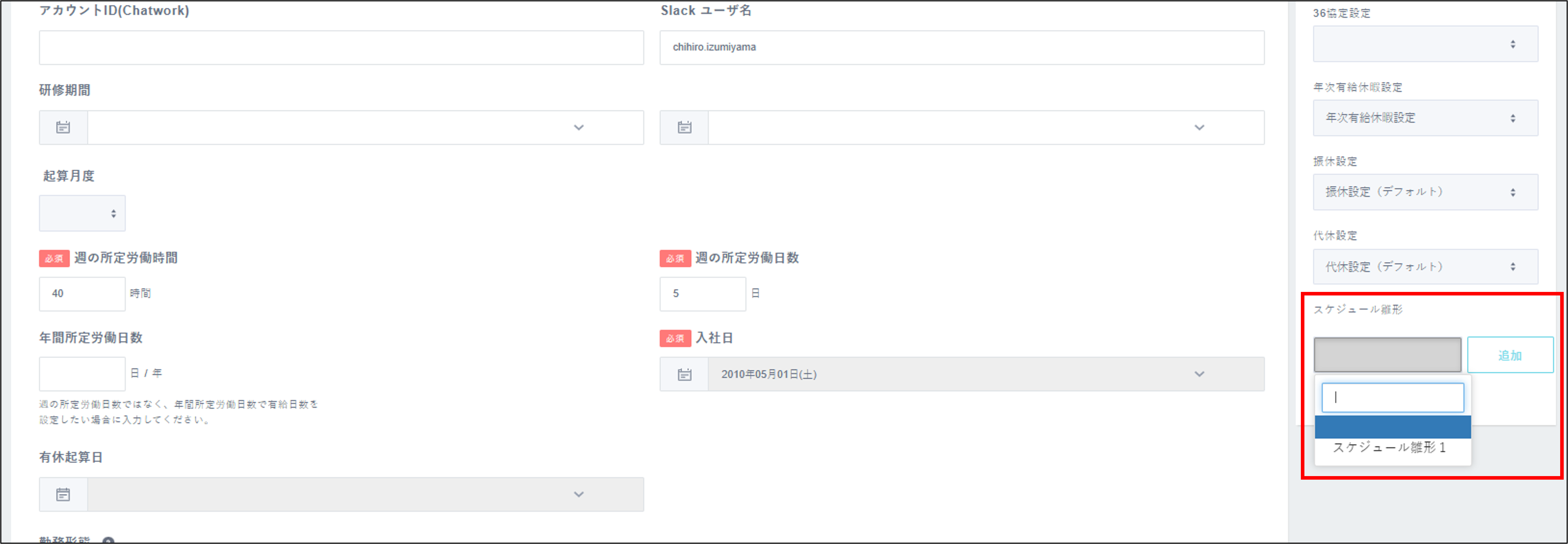 【設定箇所】従業員設定>従業員一覧>[編集]>「スケジュール雛形」