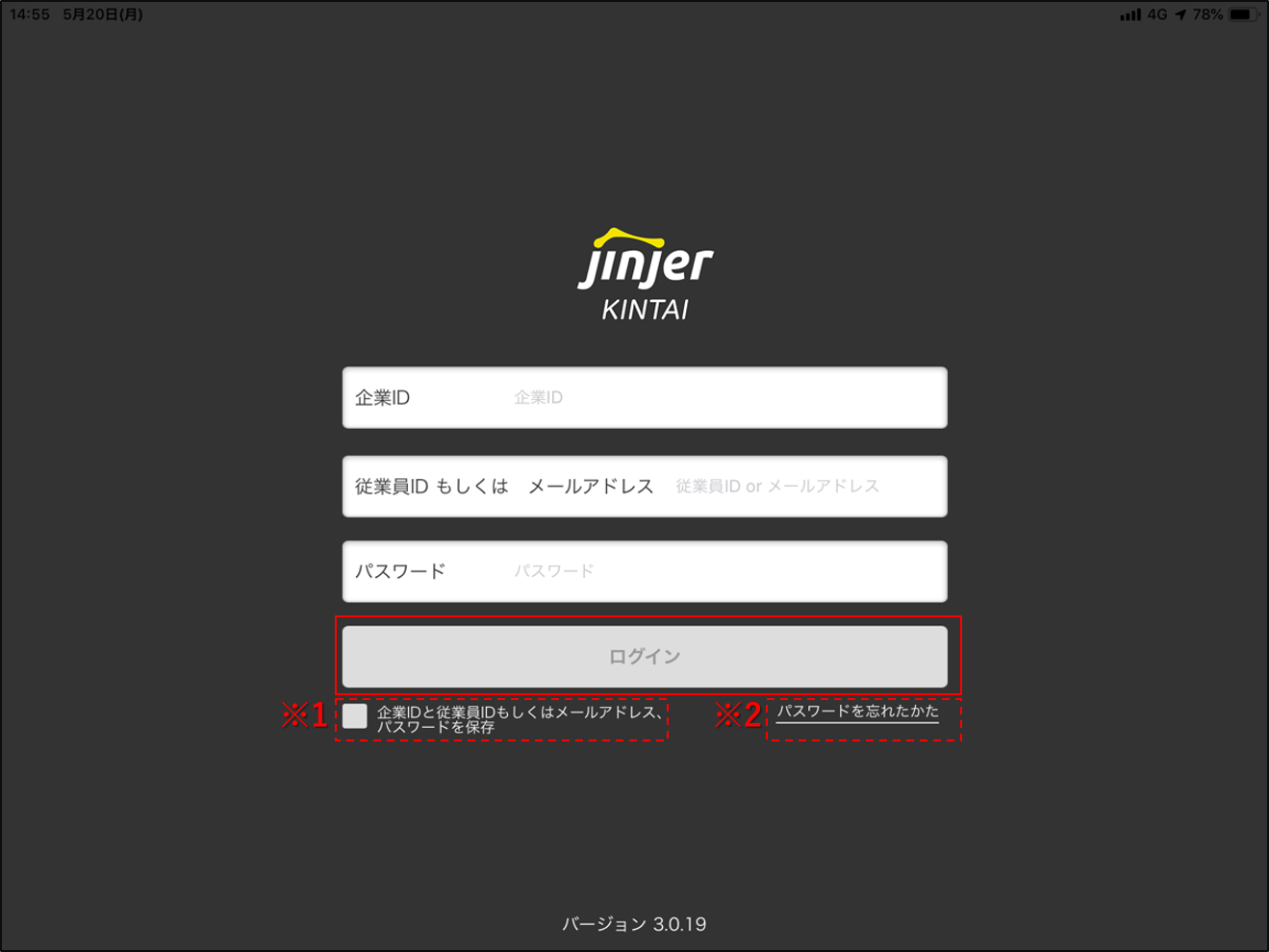ログイン画面で「企業ID」「従業員IDもしくはメールアドレス」と「パスワード」を入力します。