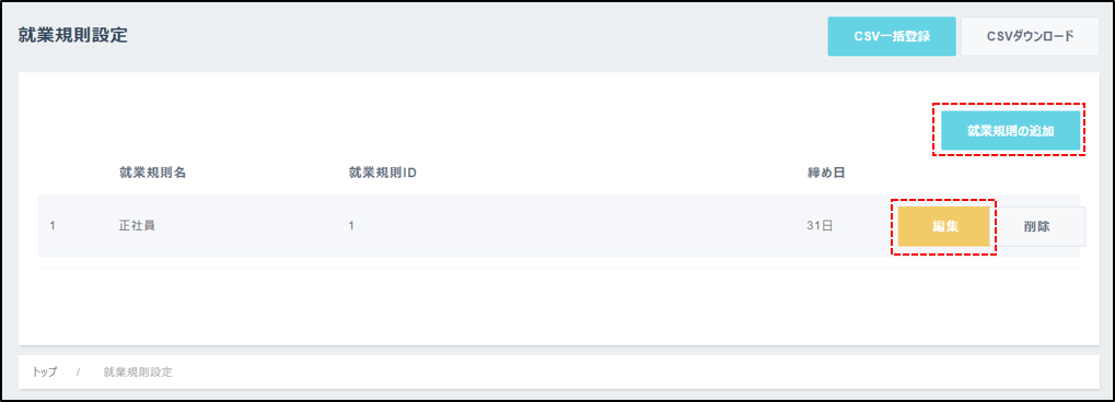 2.登録済みのマスタを編集する場合は[編集]をクリック、新規作成の場合は[就業規則の追加]をクリックします。