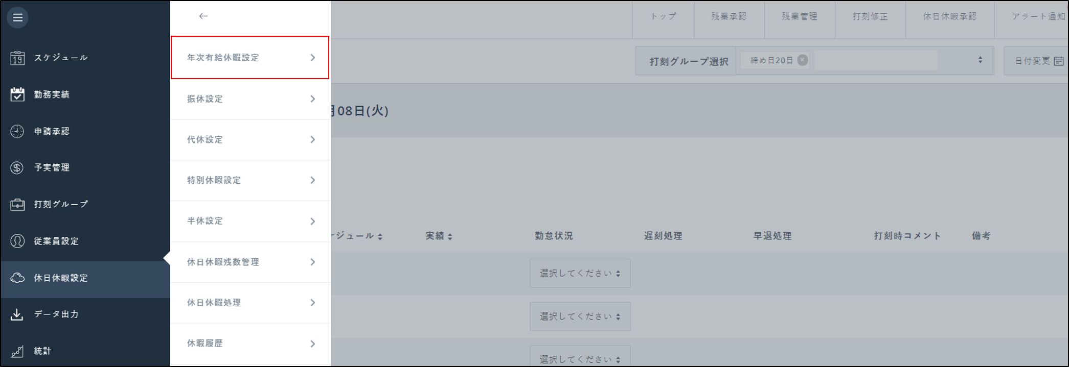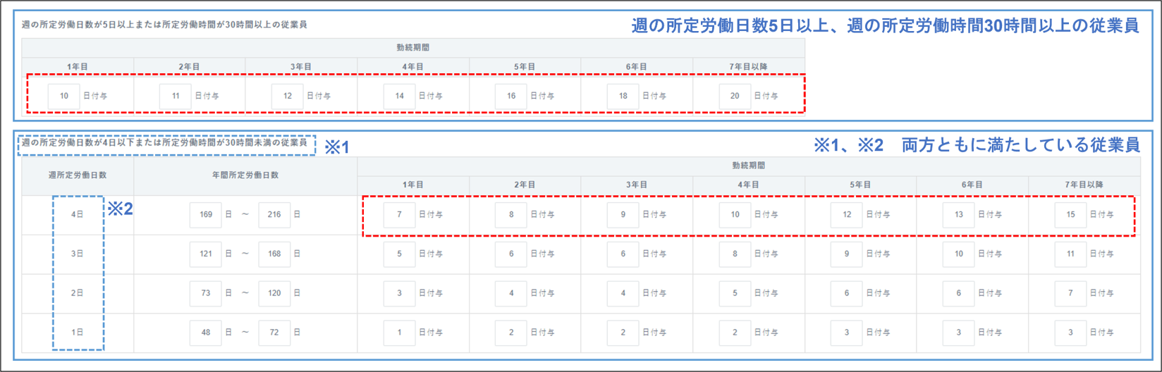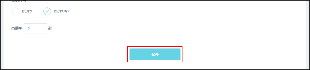 年次有給休暇を自動付与したくない場合はどのように設定しますか? 管理者で手動で付与を行う場合、以下のように設定すると自動付与はされなくなります。 1.メニューバーの[休日休暇設定]から、[年次有給休暇設定]をクリックします。2.1年目~7年目以降に”0”(半角数字ゼロ)を入力します。3.保存をクリックします。