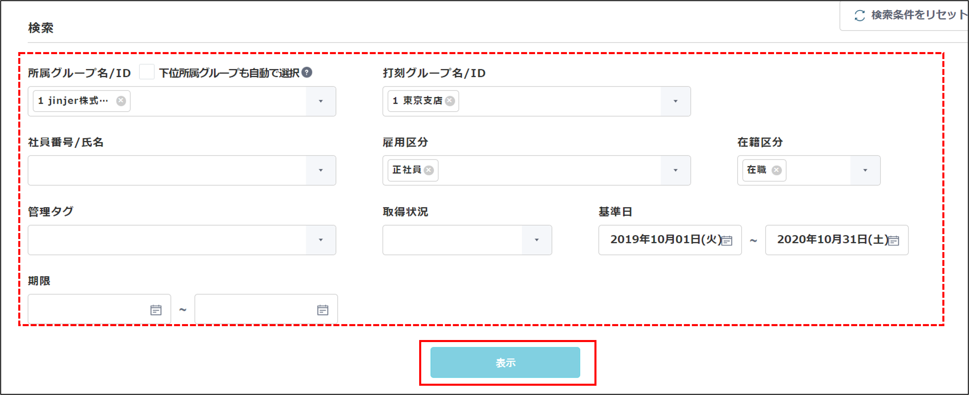 例)検索条件で「営業本部」を選択し[下位所属グループも自動で選択]にチェックを付けた場合