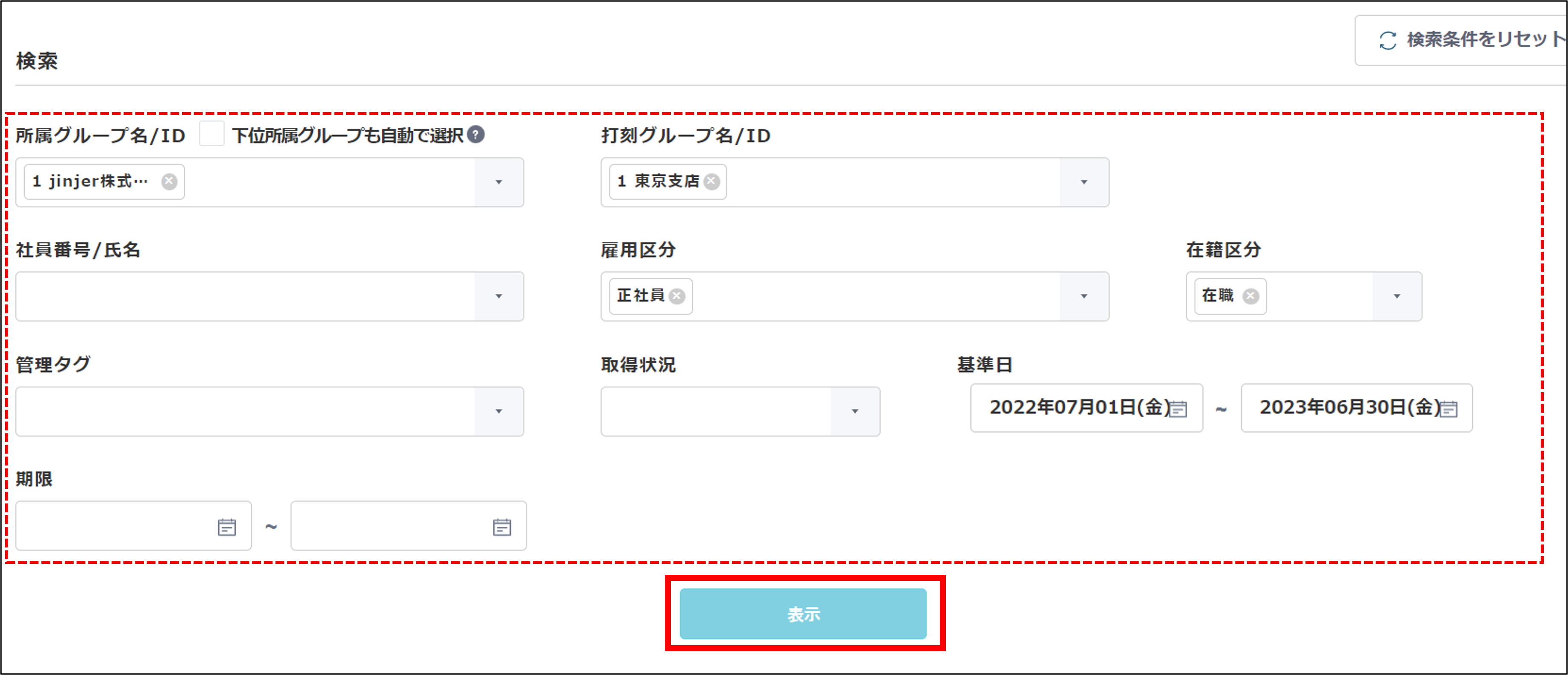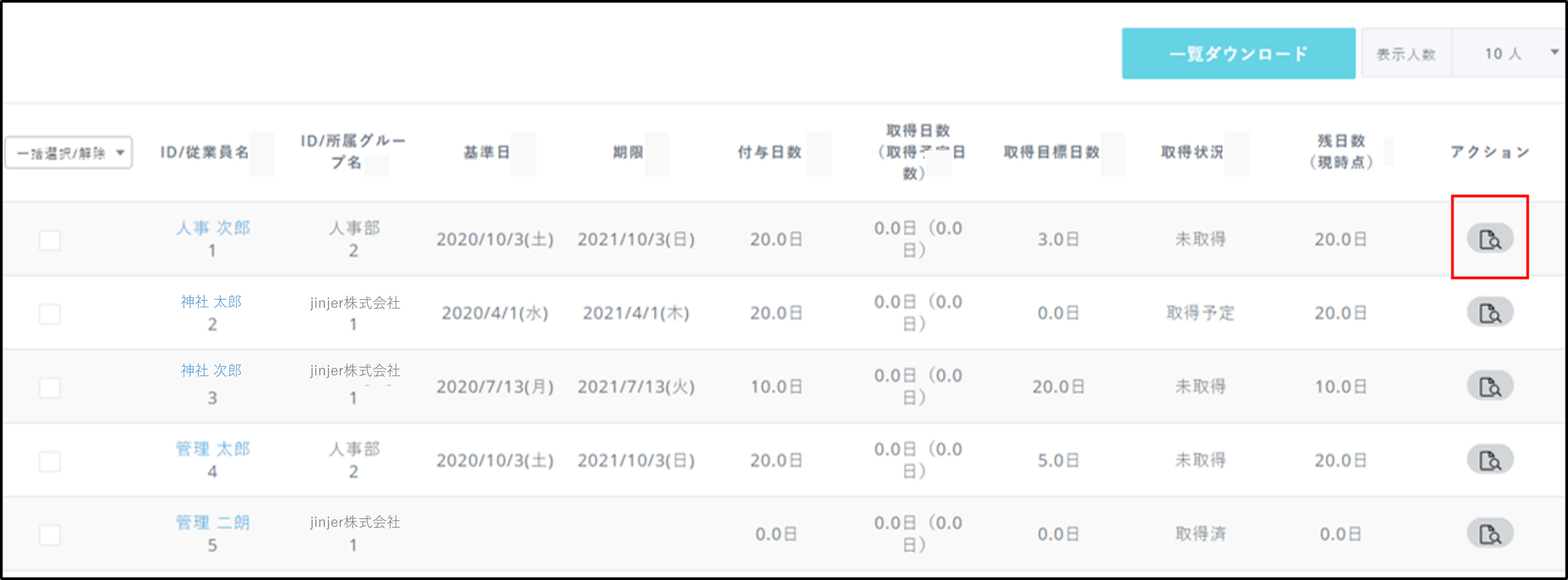 年次有給休暇取得状況権限下の打刻グループに紐づく従業員が表示されます。