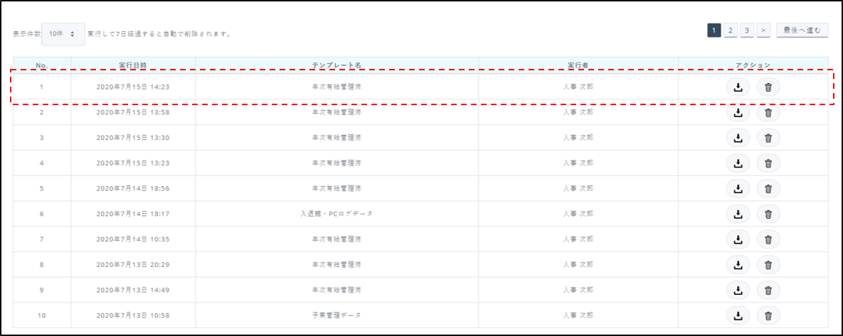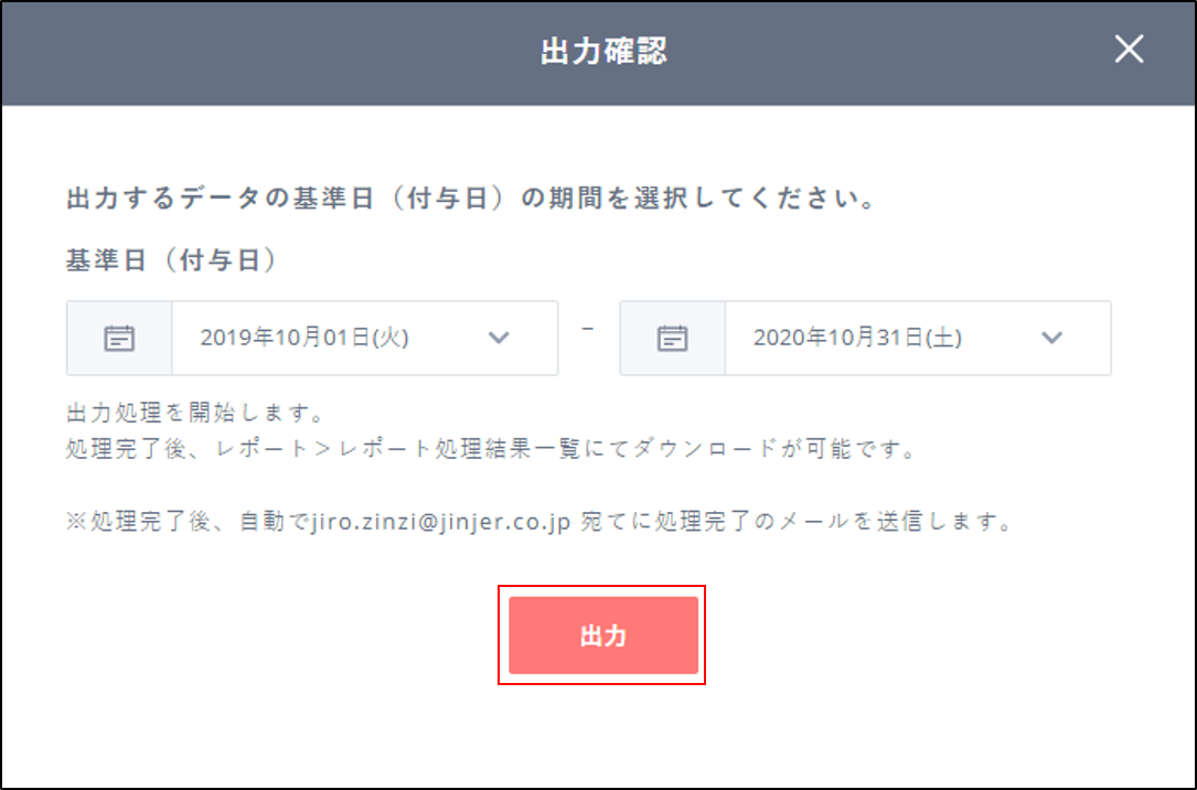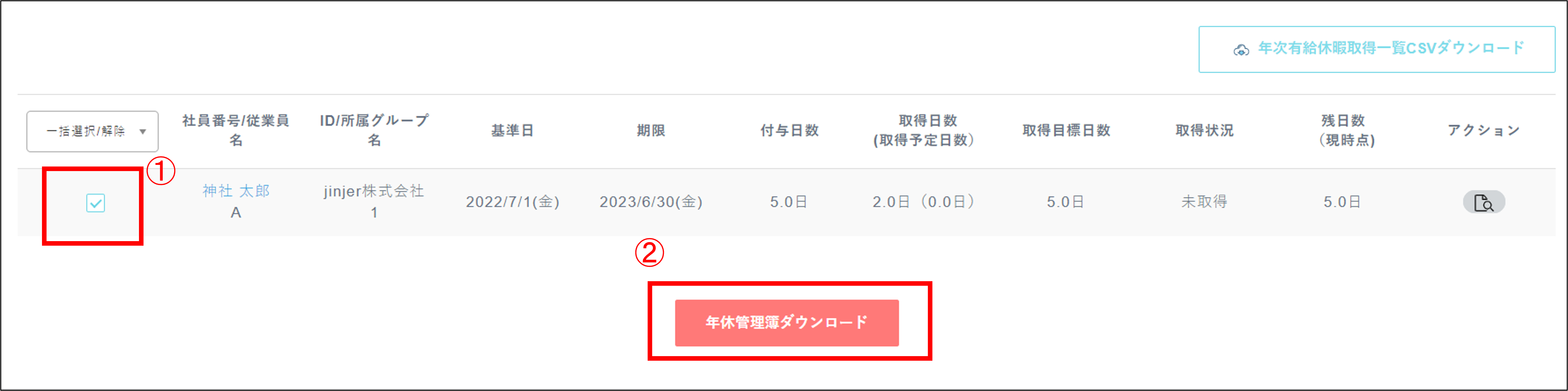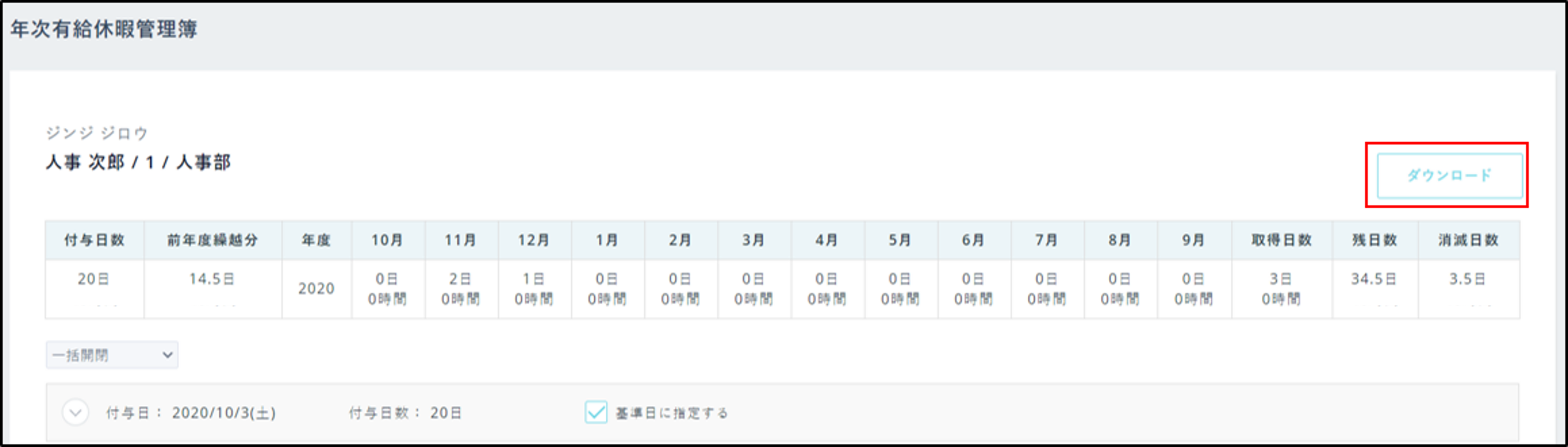 年次有給休暇取得一覧から、年次有給休暇管理簿を出力することができます。