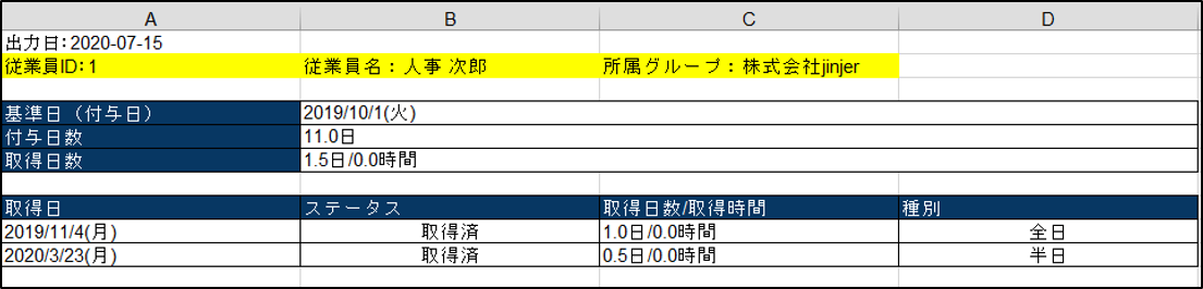 従業員ごとに有給休暇の付与日数・基準日(付与日)・取得日数が記載されており、