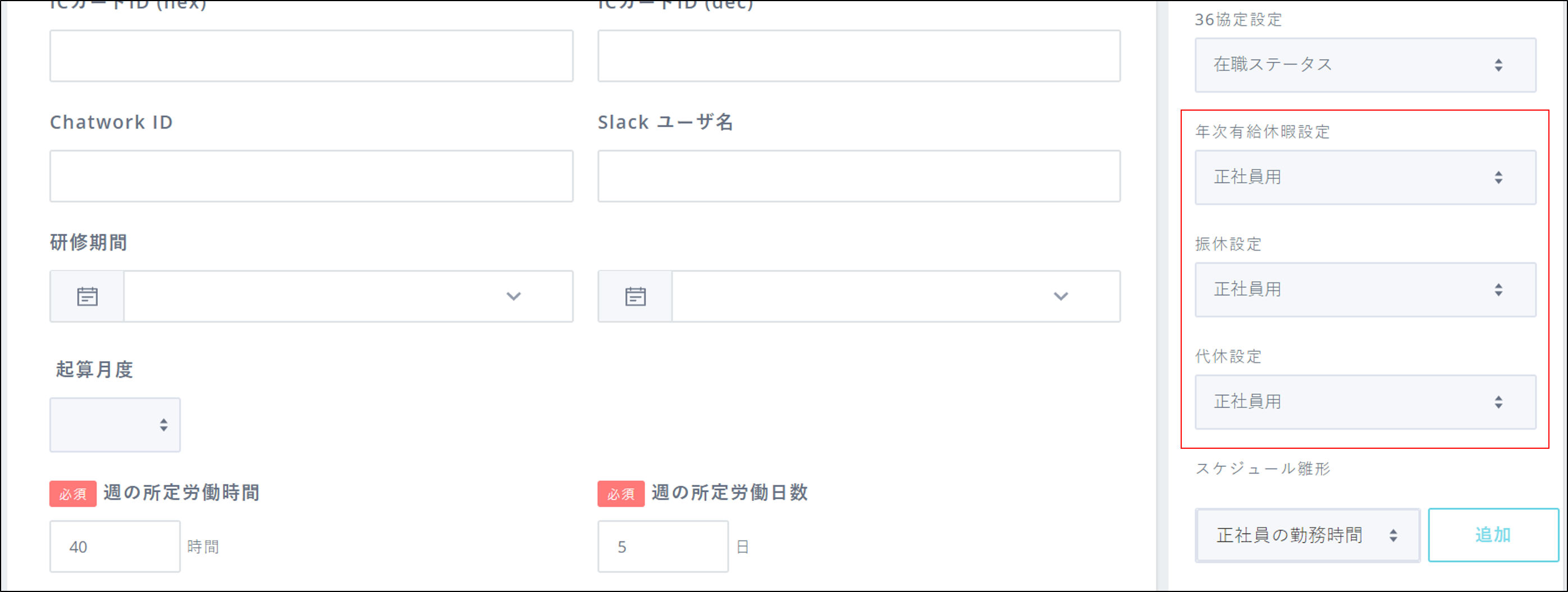 ※新しく従業員を登録した場合、各設定のIDが最も若いマスタが自動で紐づきます。