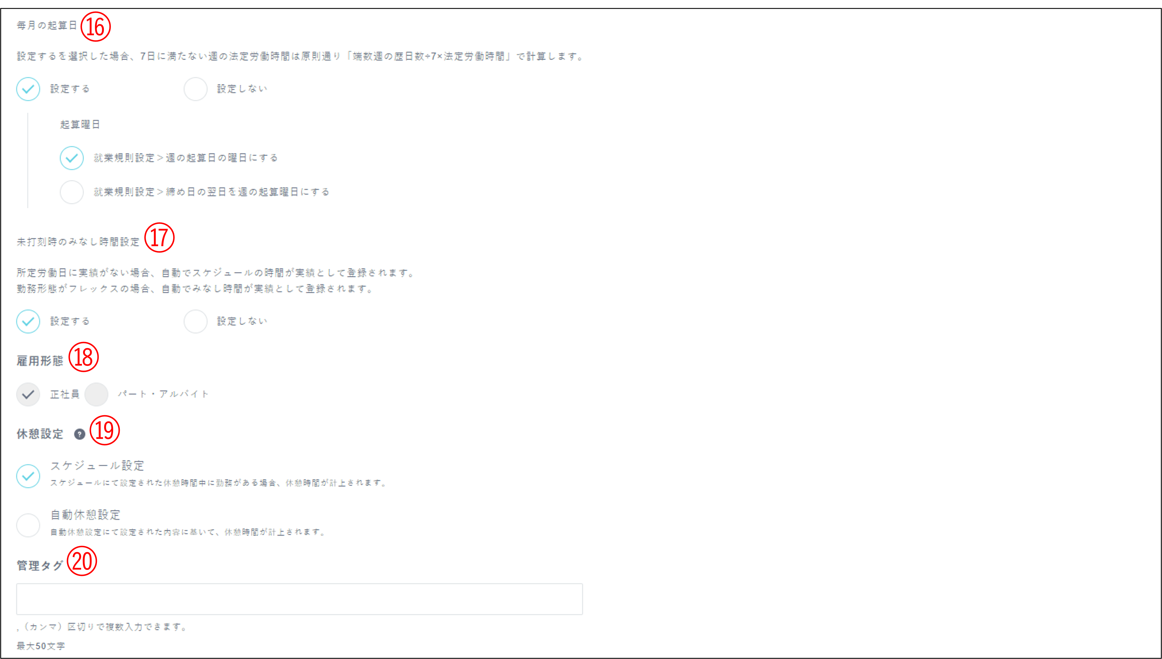 ※本項目を設定した場合は、就業規則設定の週の起算日で設定されていても、本設定内容が適用されます。