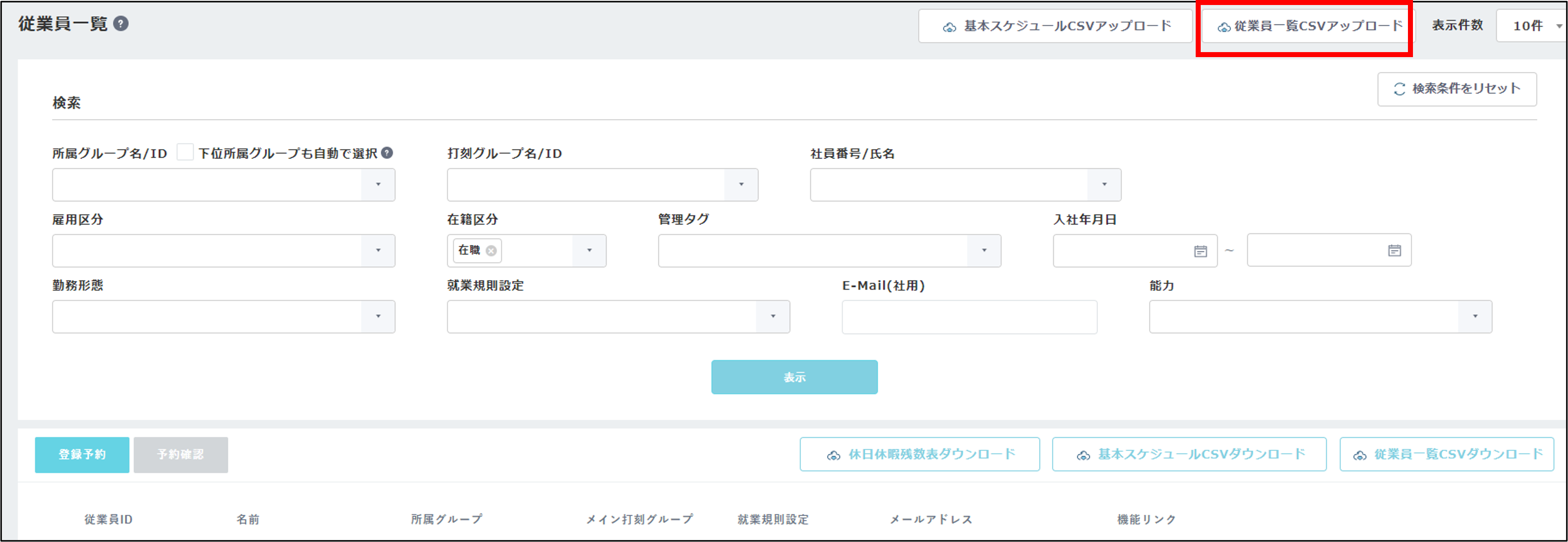 5.[従業員一覧CSVアップロード]をクリックし、ファイルをアップロードします。