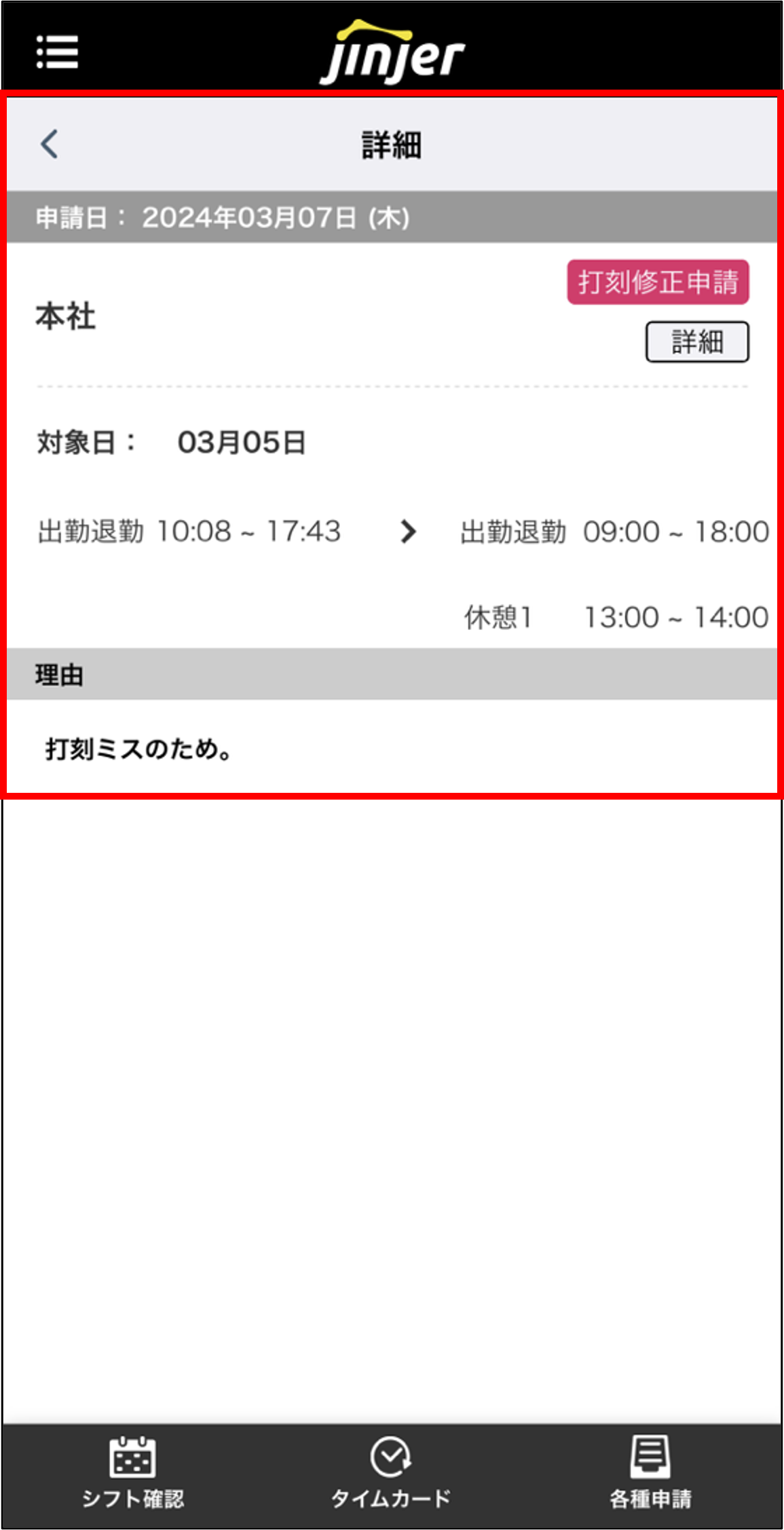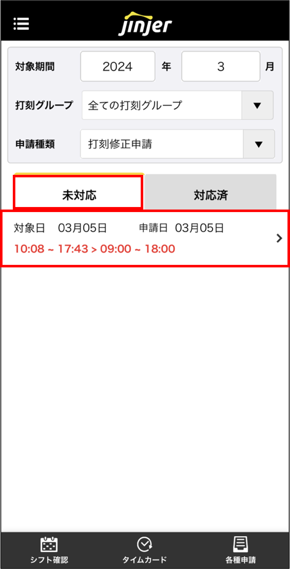 従業員アプリで申請履歴を確認する/取り消す スマートフォンの従業員アプリで自身の申請内容を確認したり、申請を取り消す方法をご案内します。パソコンでの操作方法はこちら申請履歴を確認する申請を取り消す申請履歴を確認する1.左上のメニューバーをタップします。 2.[申請一覧]をタップします。 3.確認したい申請の条件を選択/入力し、対応済タブから対象の申請をタップします。 4.詳細が表示されます。 申請を取り消す1.左上のメニューバーをタップします。 2.[申請一覧]をタップします。 3.取り消したい申請の条件を選択/入力し、未対応タブから対象の申請をタップします。 4.[申請取消]をタップします。5.[OK]をタップして取り消し完了です。