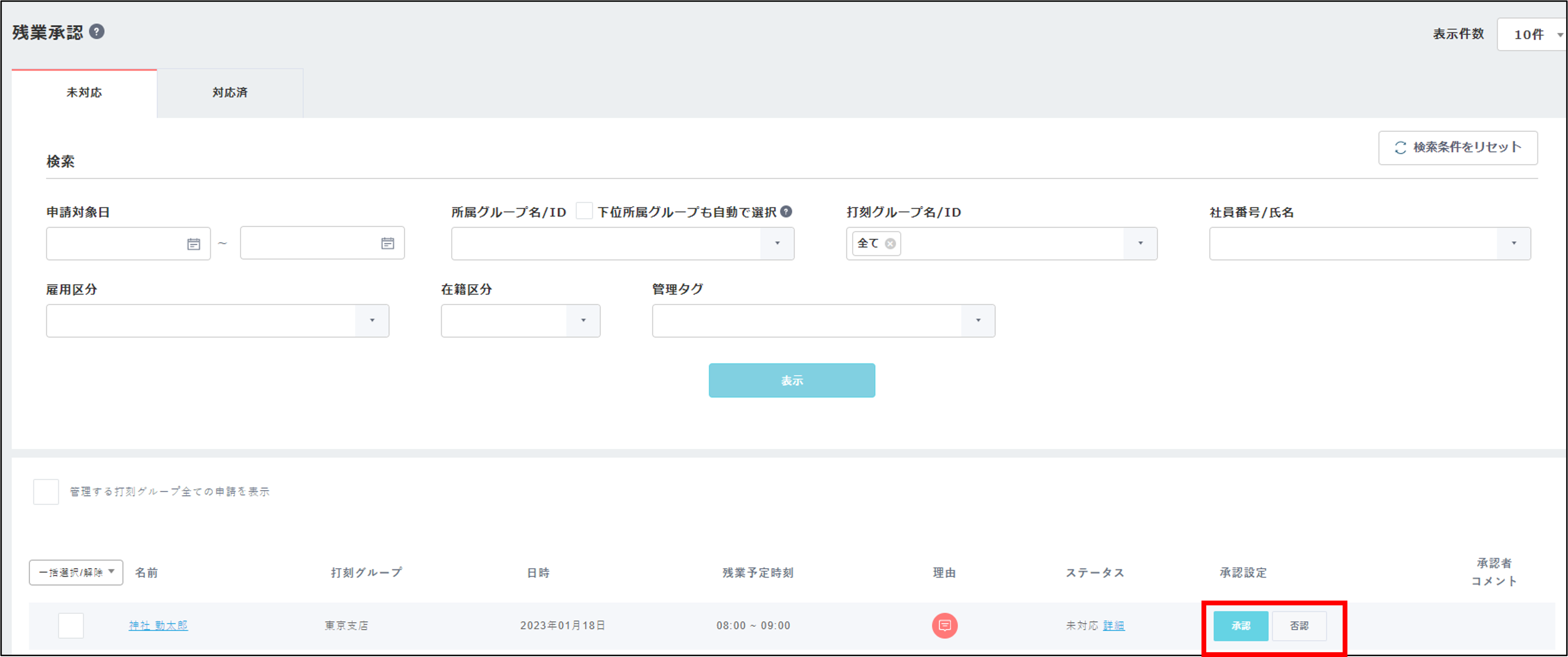 承認対象外の従業員の申請内容を表示でき、承認/否認処理も行うことができます。