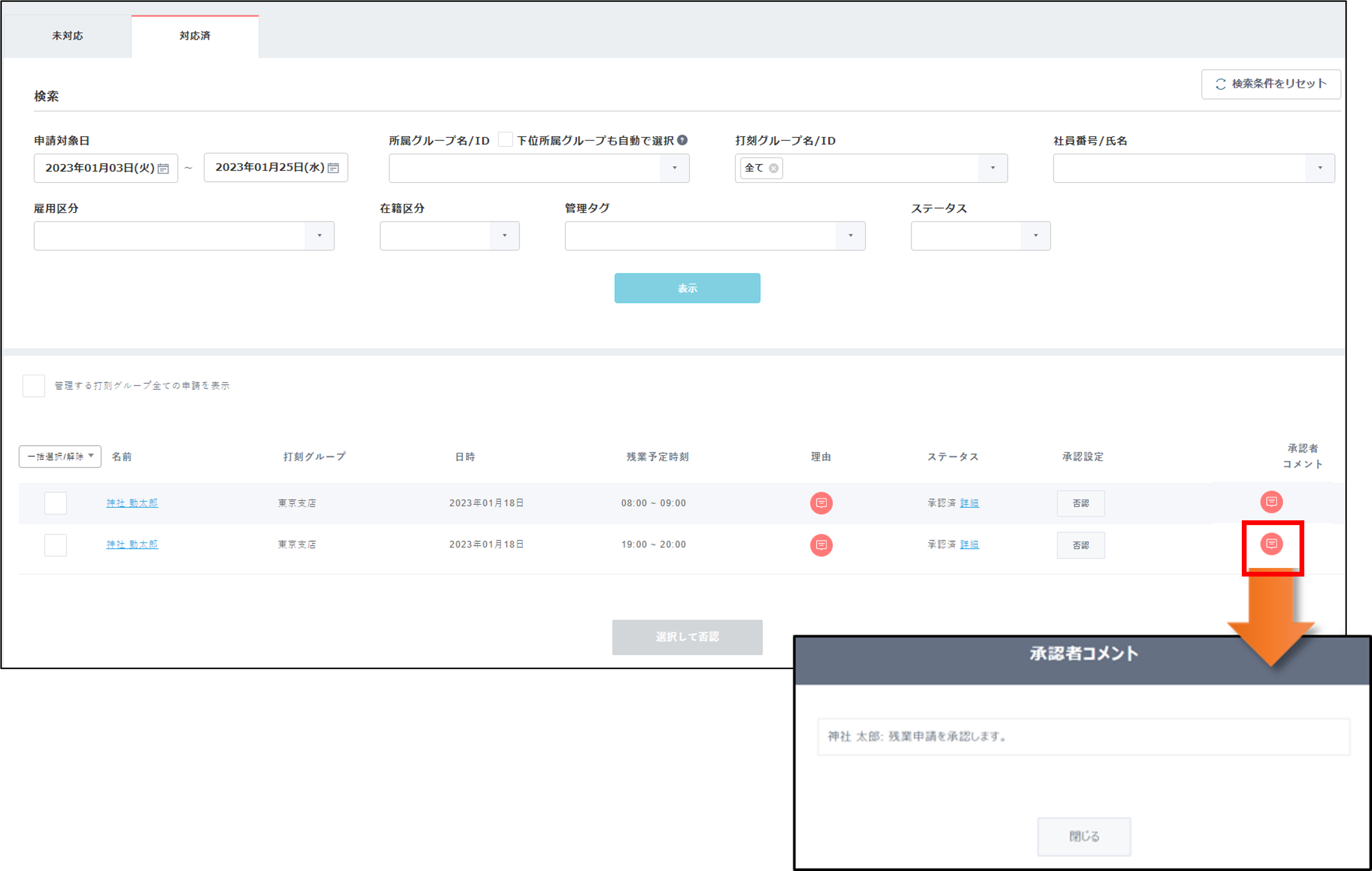 3.[承認者コメント]欄の[吹き出しマーク]をクリックすると、入力したコメントを閲覧できます。
