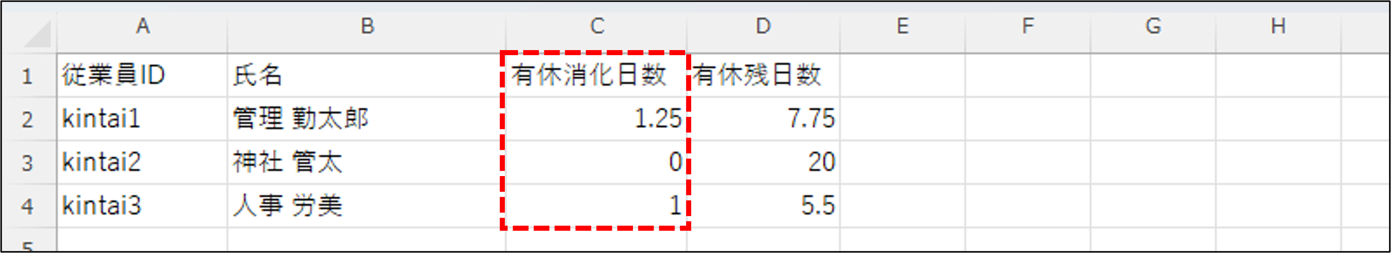 3.締め処理月ごとに出力されたデータの項目「有休消化日数」を確認します。
