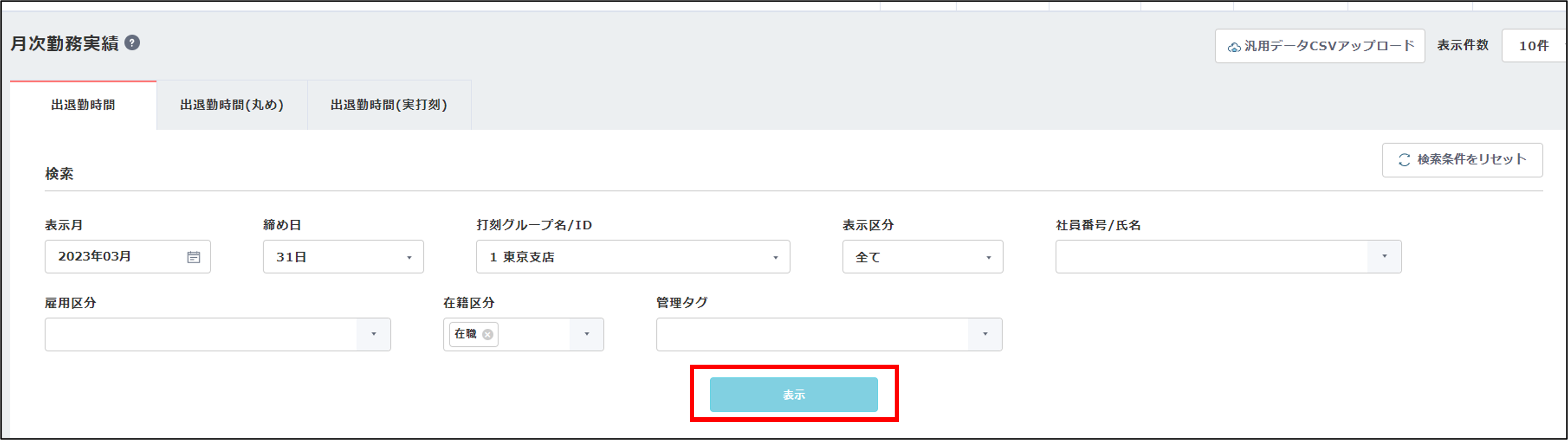 2.実績の編集対象月を表示させるため、[打刻グループ選択] [表示区分] [月変更]を選択して[表示]をクリックします。