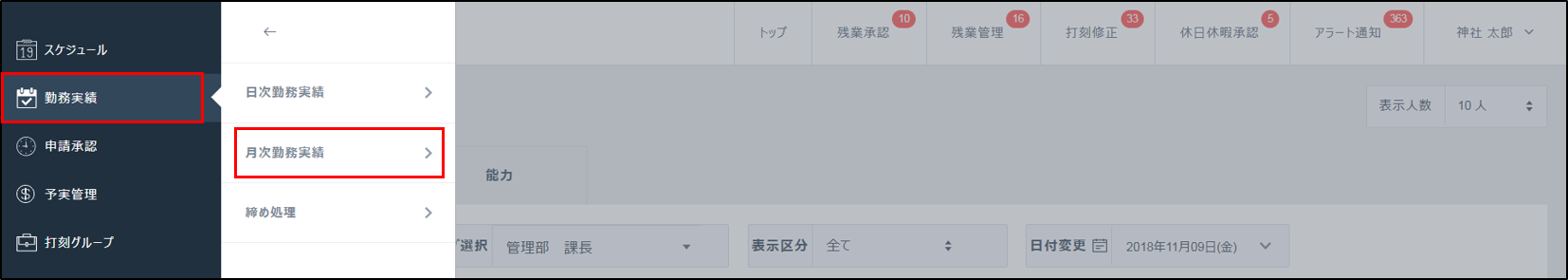 1.[勤務実績]>[月次勤務実績]をクリックします。