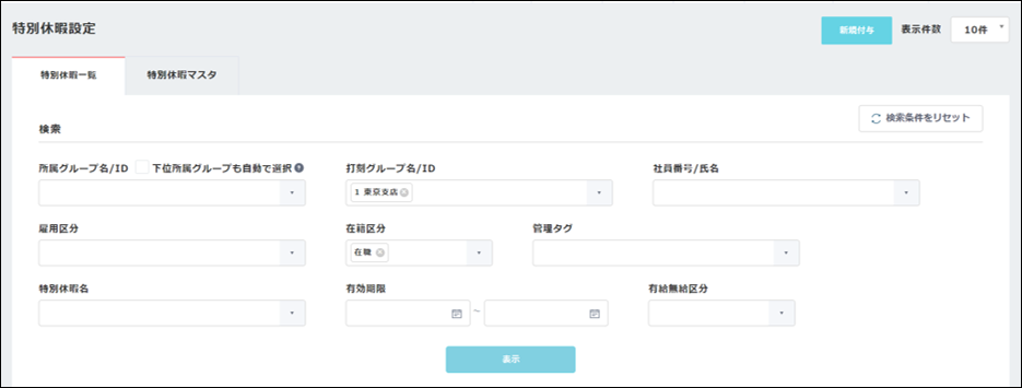 該当画面:休日休暇設定>特別休暇設定>特別休暇一覧