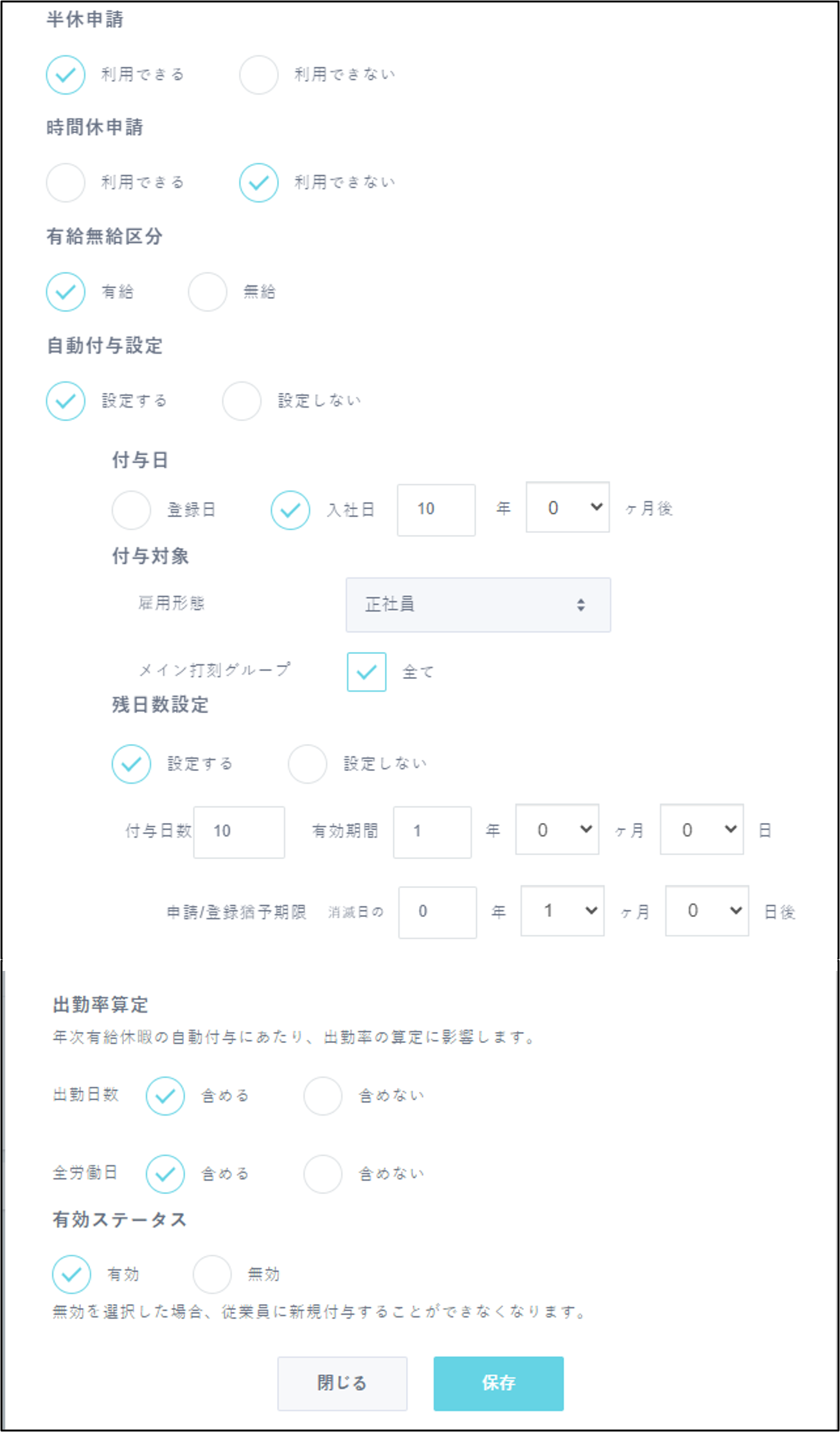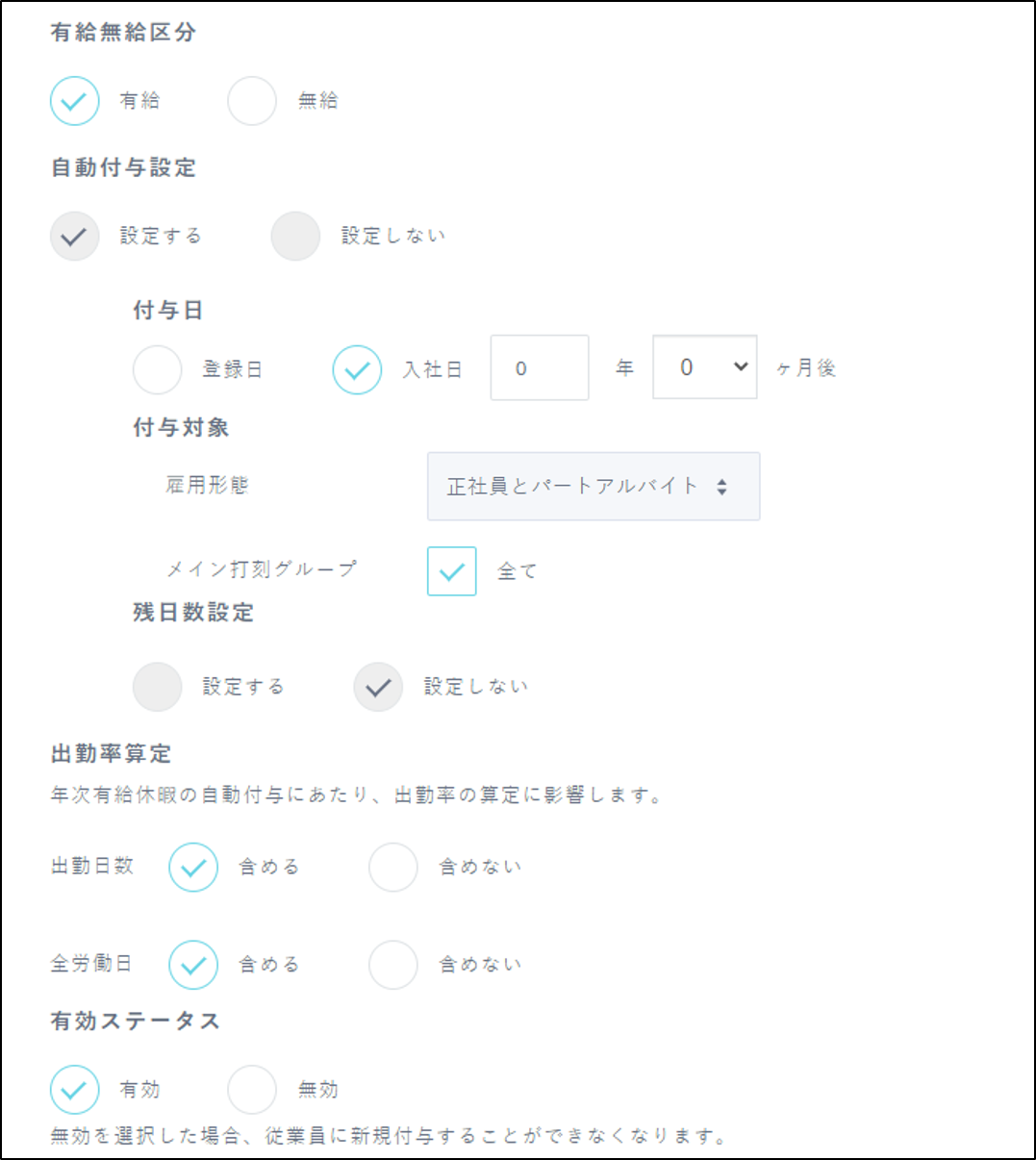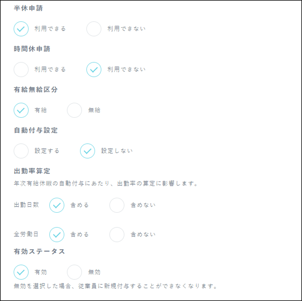 休暇の種類によって設定方法がありますので、下記設定例をご参照ください。