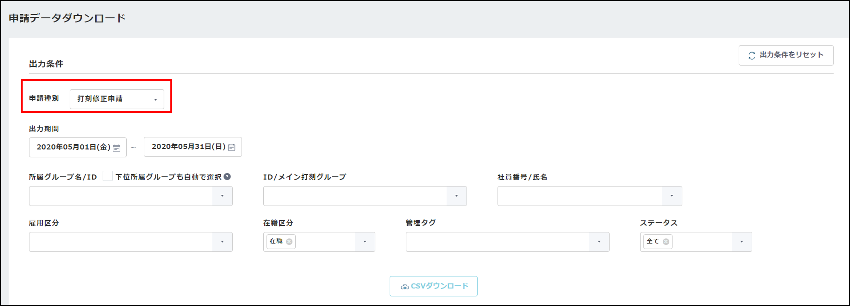 3.さらに出力条件を選択し、[CSVダウンロード]をクリックします。