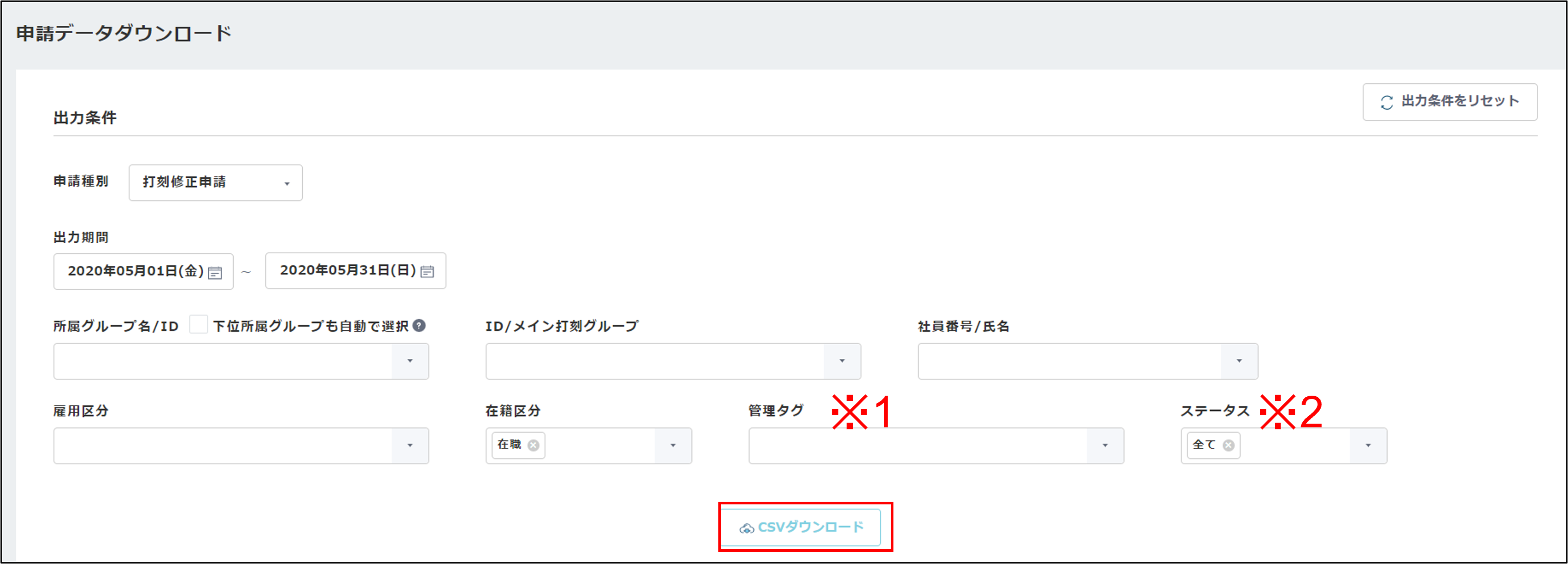 ※2:全て/申請中/承認済/否認済 より出力したい条件を設定してください。