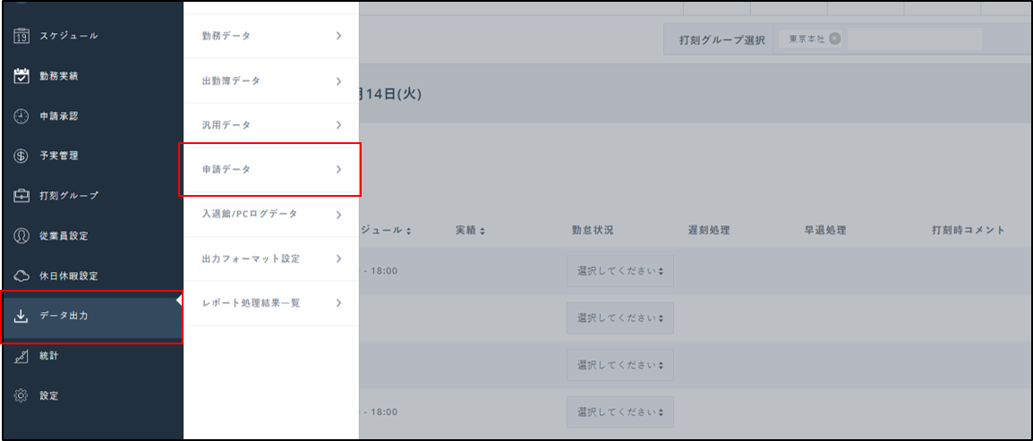 該当画面:データ出力>申請データ