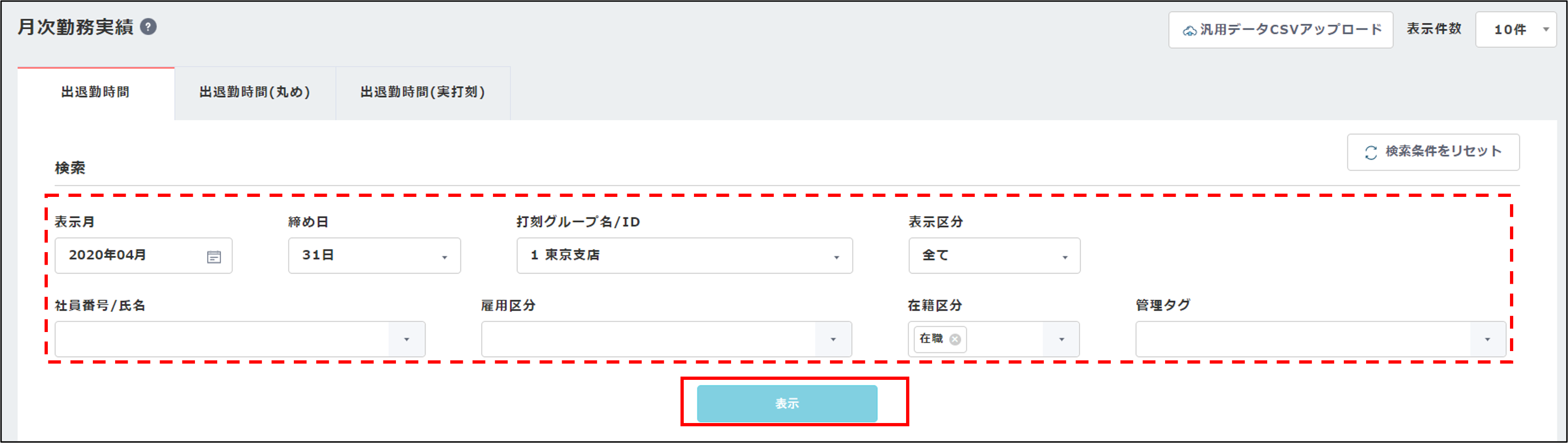 2.該当月と該当打刻グループを選択し[表示]をクリックします。