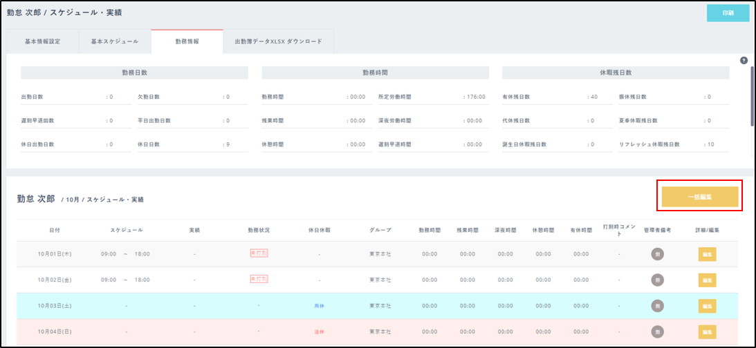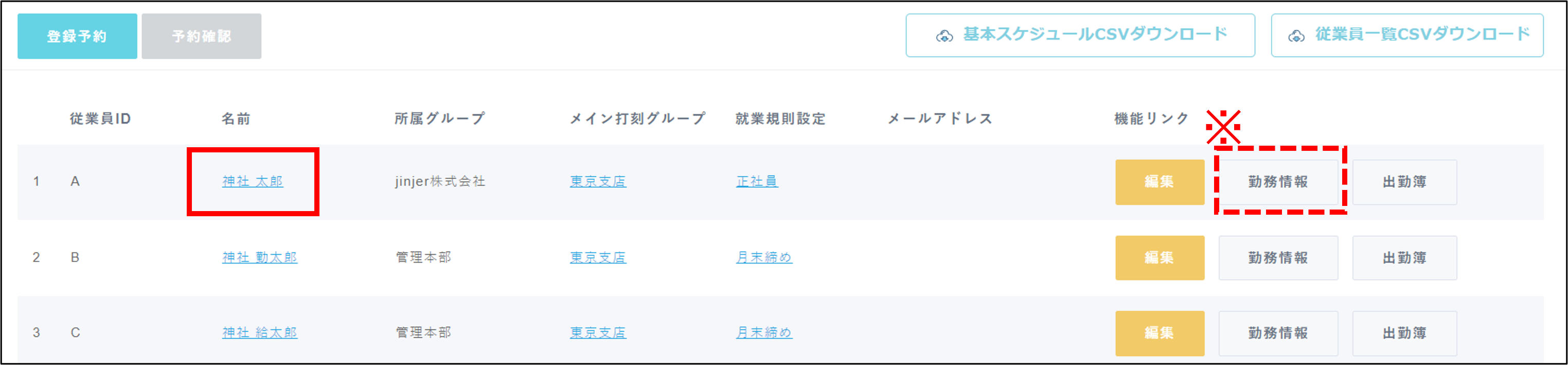 従業員設定>従業員一覧>該当従業員の勤務情報