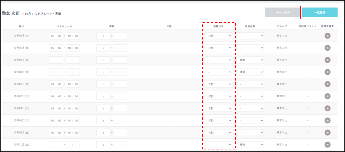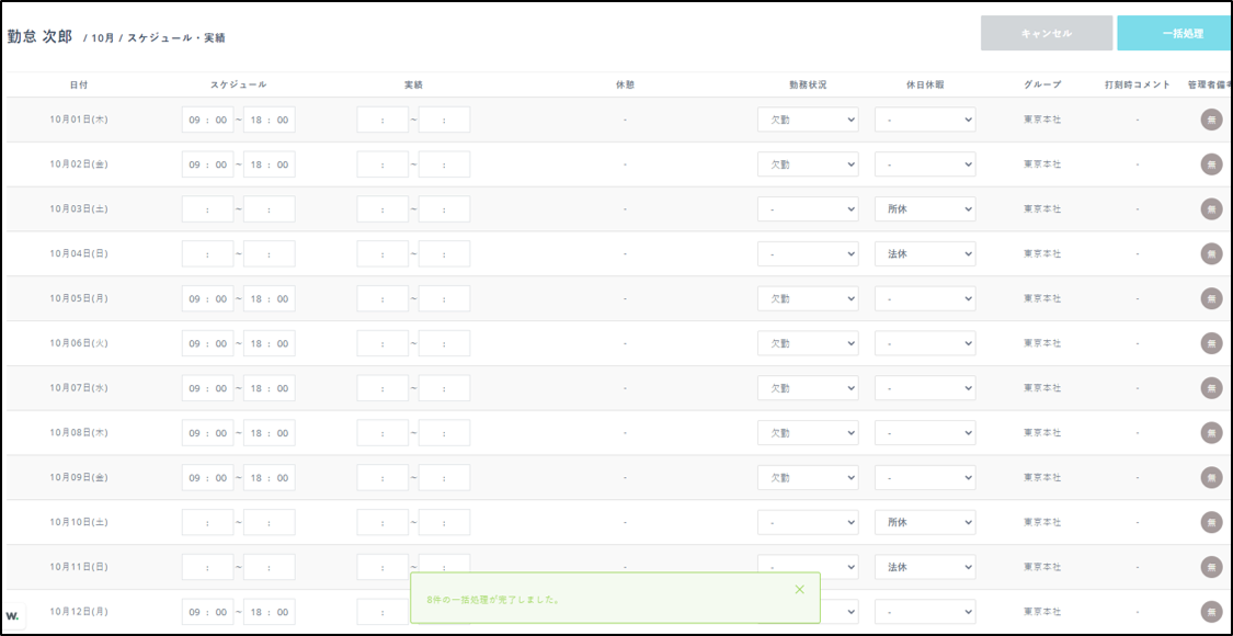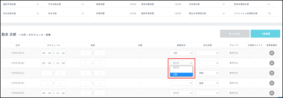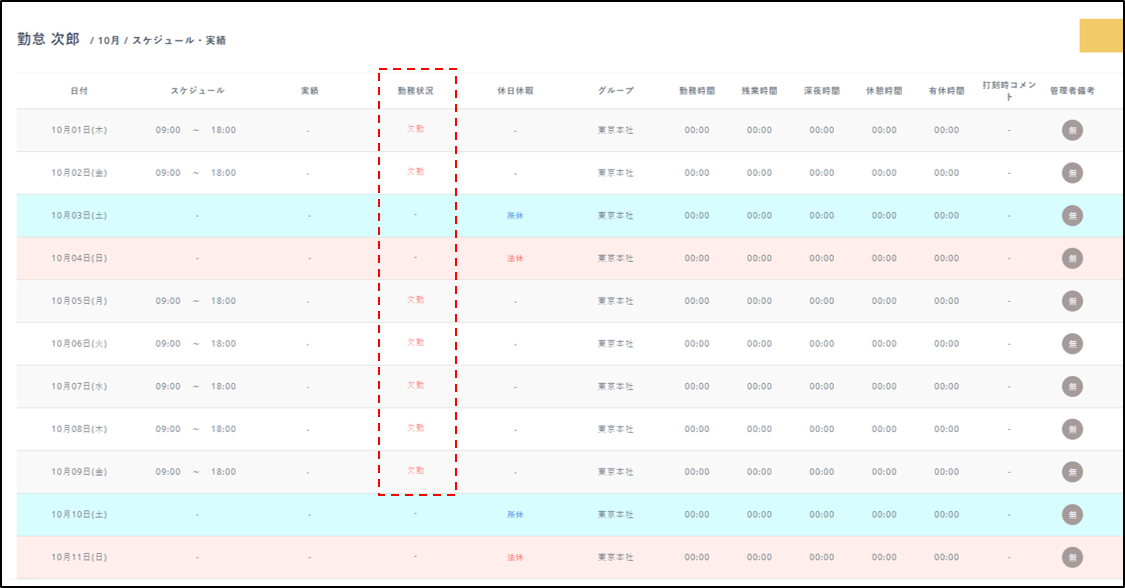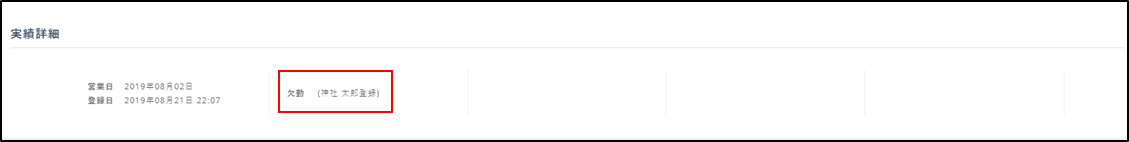 管理者画面の下記画面から「欠勤」の登録ができます。