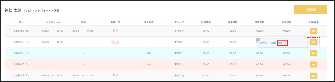 2.該当日の[編集]をクリックし、[実績入力]を選択します。