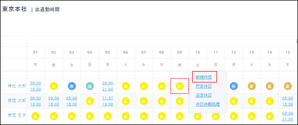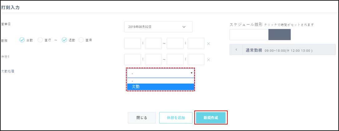 3.欠勤処理のプルダウンから[欠勤]を選択し[新規作成]で編集完了です。