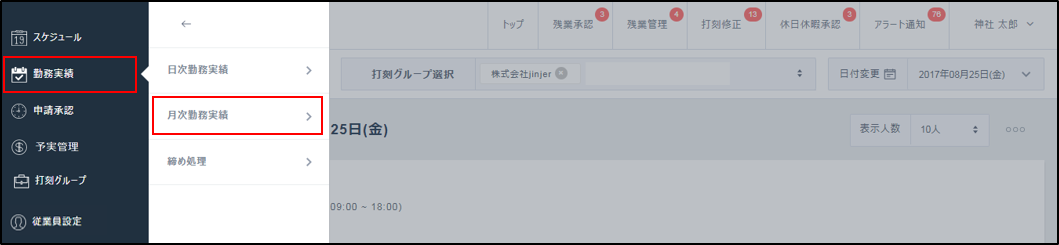 1.[勤務実績>[月次勤務実績]をクリックします。
