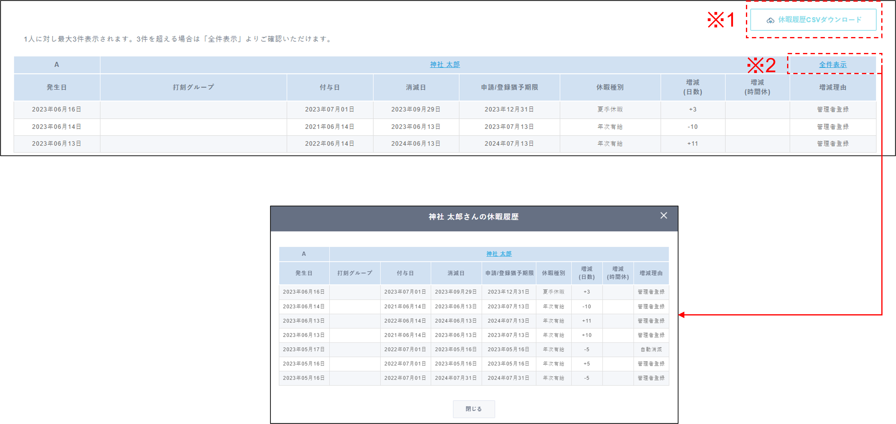 ※1 休暇履歴はCSV形式でデータをダウンロードできます。
