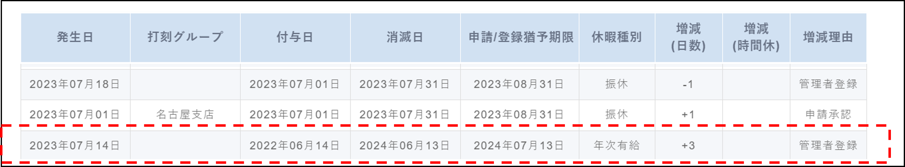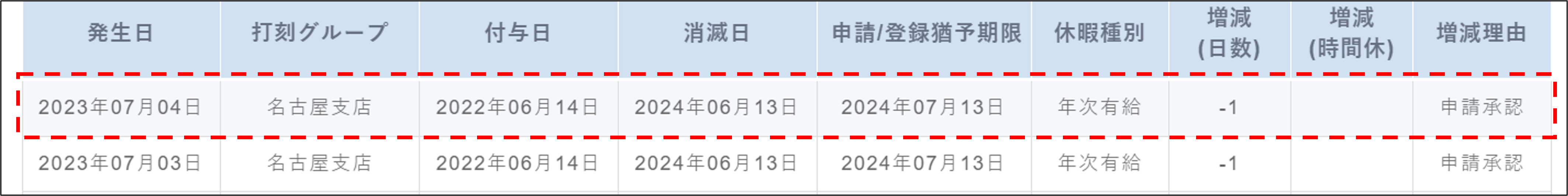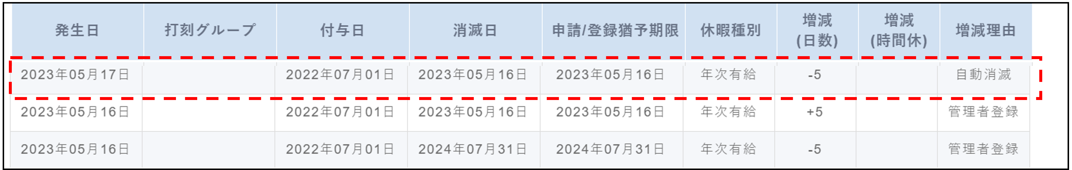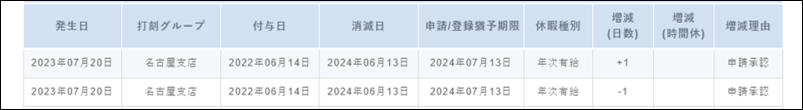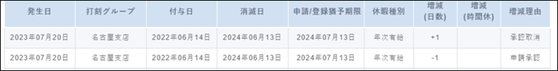 この時点で、休暇使用分としての-1、消滅日を経過している休暇利用として+1の履歴が残る