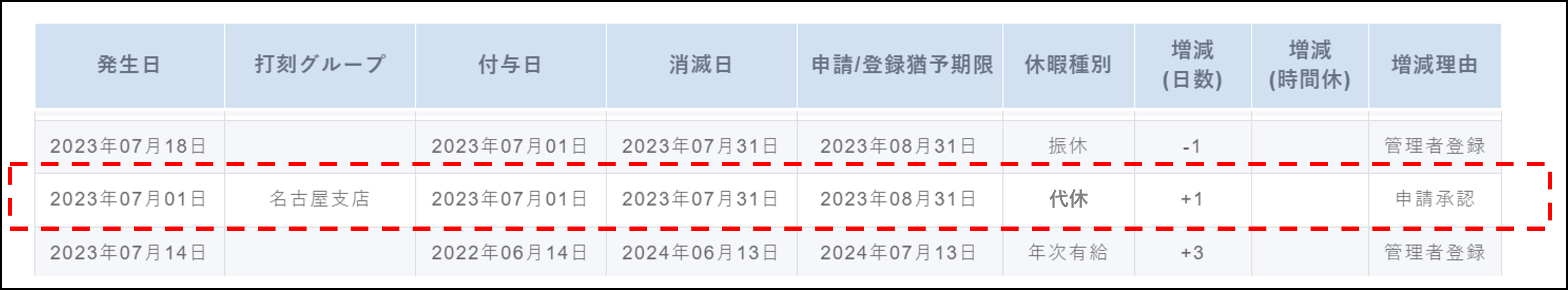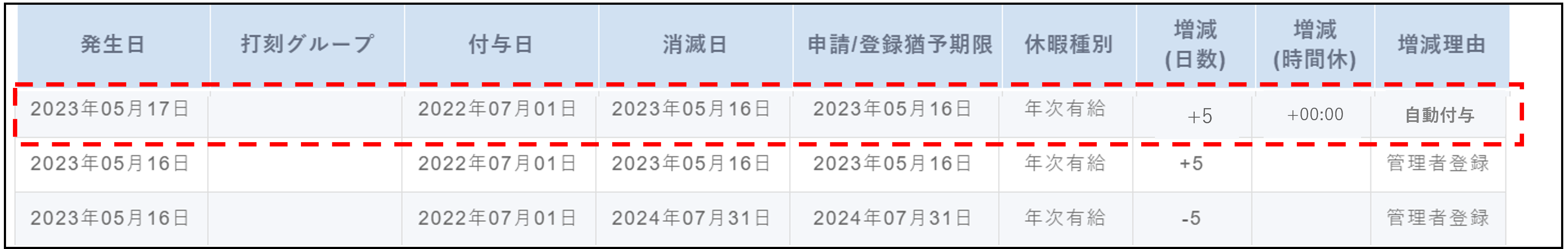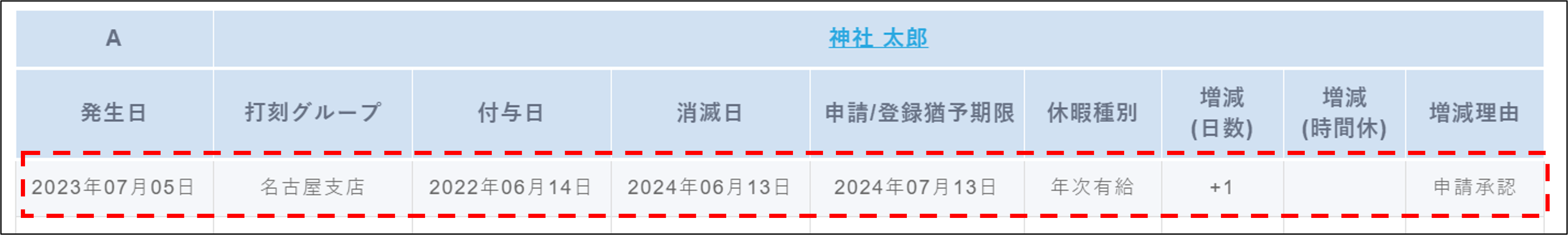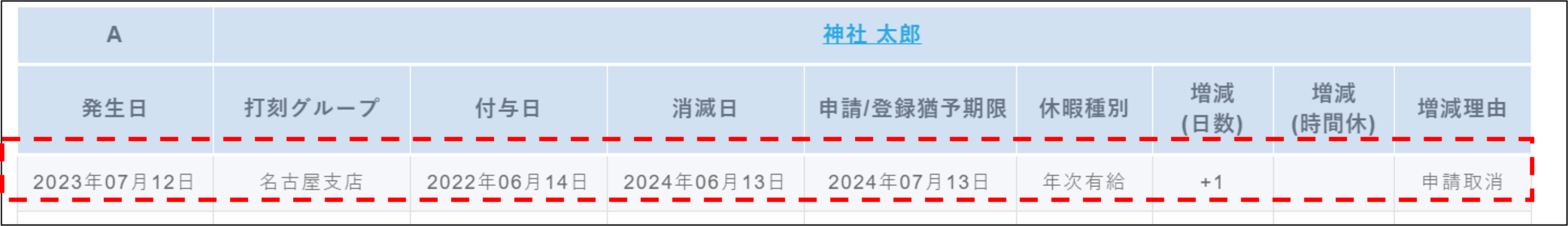 この時点で、休暇使用分としての-1、消滅日を経過している休暇利用として+1の履歴が残る