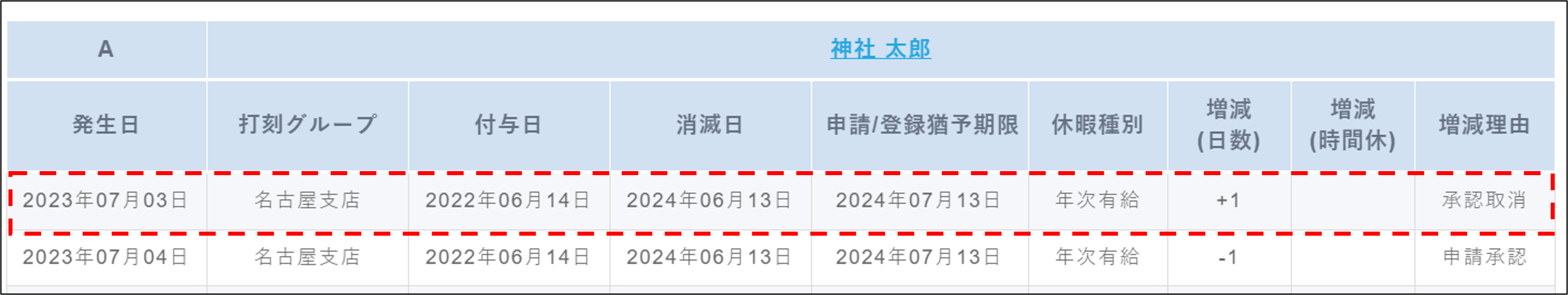 7月18日に申請をした7月20日の休暇申請を、7月18日に承認した後、同日に承認取り消しをした場合、発生日は休暇取得日の7月20日として登録されます。