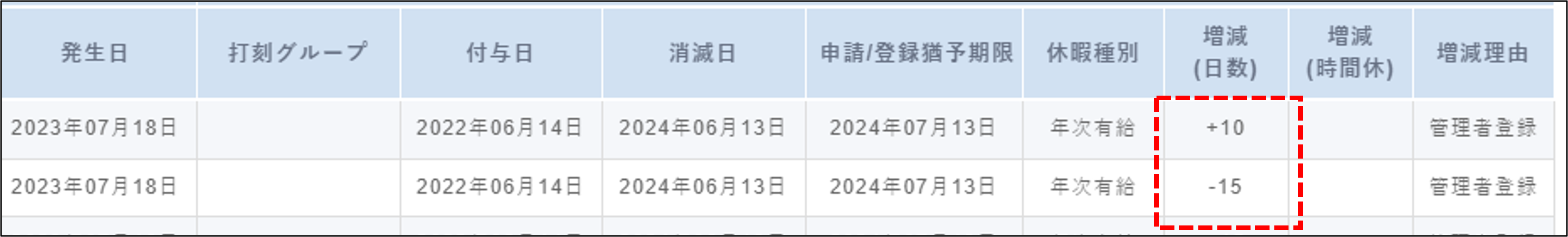 休日休暇残数管理画面で編集すると、編集前の残日数をマイナスしたレコード/編集後の残数がプラスされたレコードの2種類が登録されます。