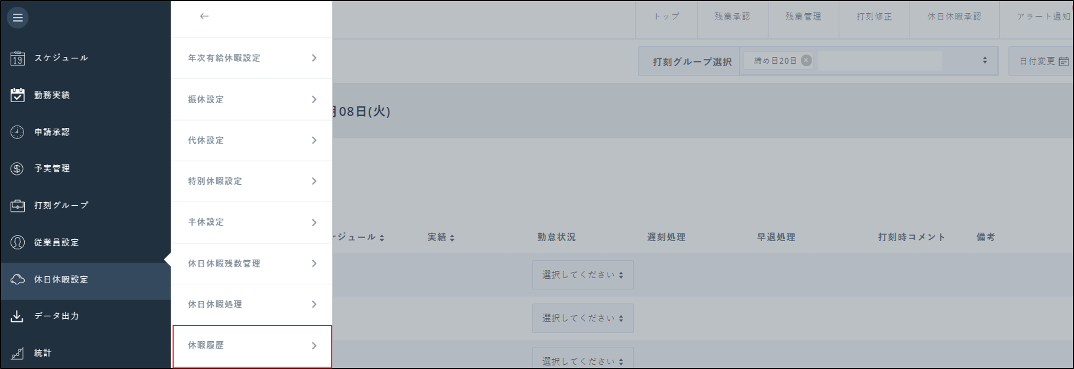 1.休日休暇設定>[休暇履歴]をクリックします。