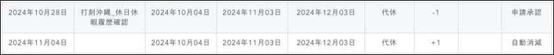 2024/11/26以降、付与時点で申請/猶予期限内だが消滅日を過ぎている振休と代休を取得した際に、以下のような自動消滅の履歴が残ります。