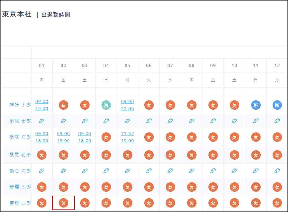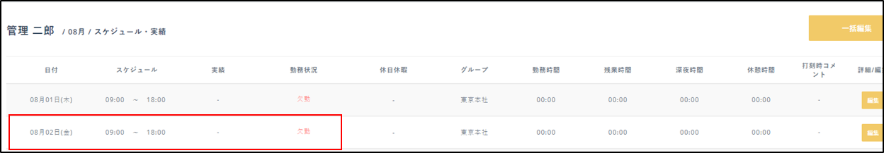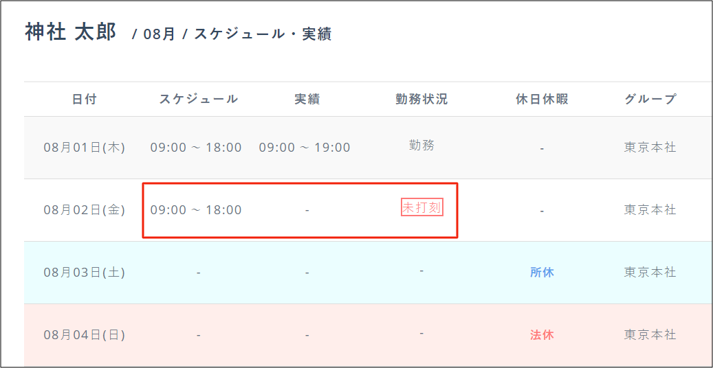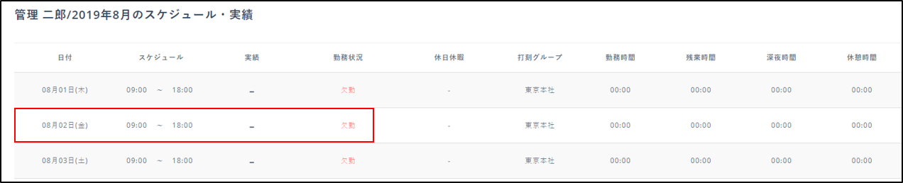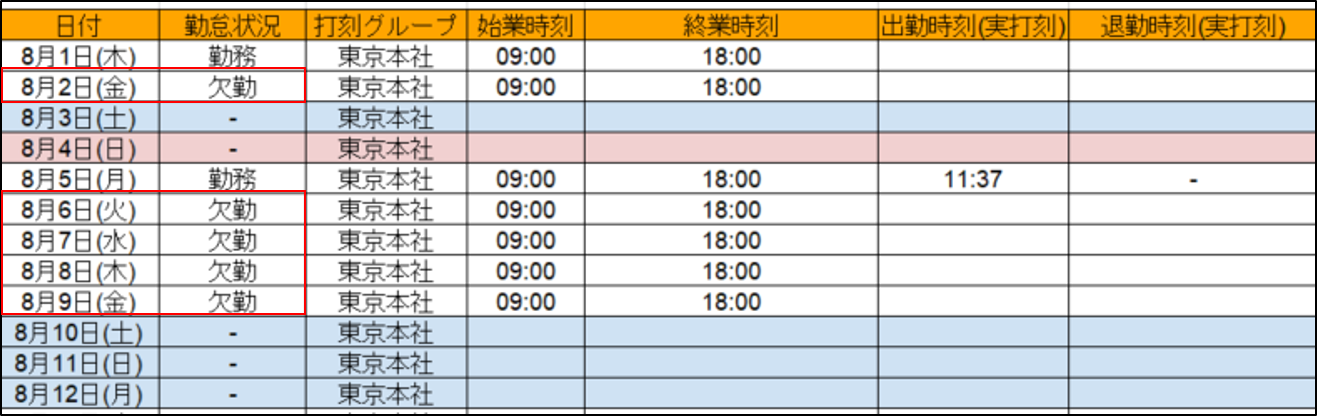 所定休日/法定休日が登録されていない日に、打刻実績が無いと欠勤扱いとなります。