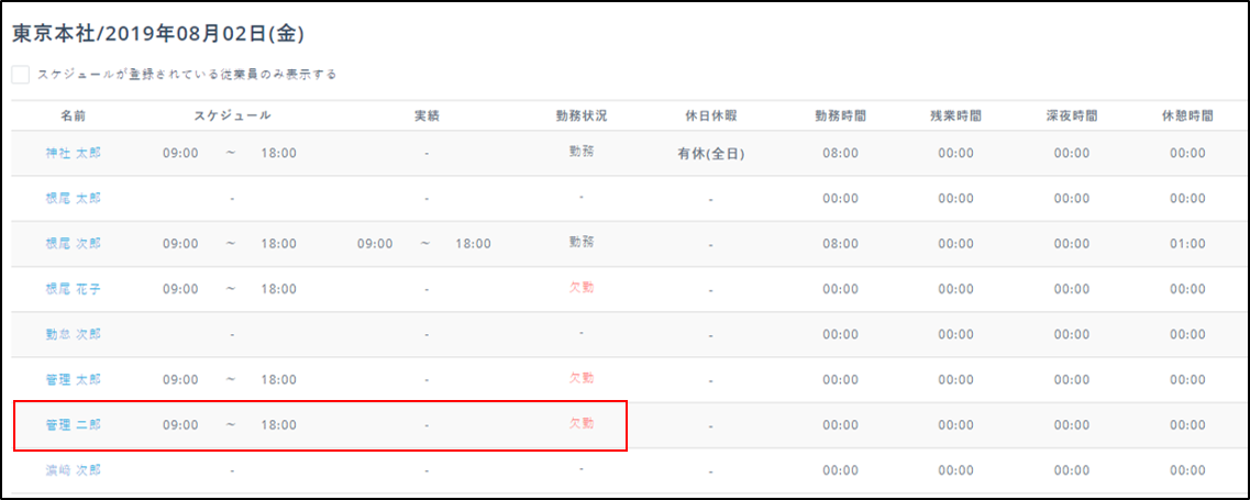 休職中の従業員は、スケジュールが登録されている場合欠勤扱いとなります。