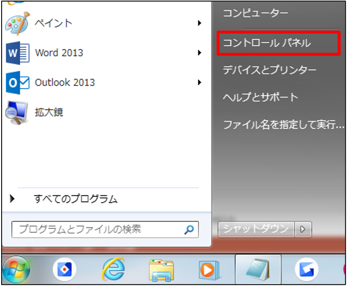 1.PCのスタートボタン>[コントロールパネル]をクリックします。