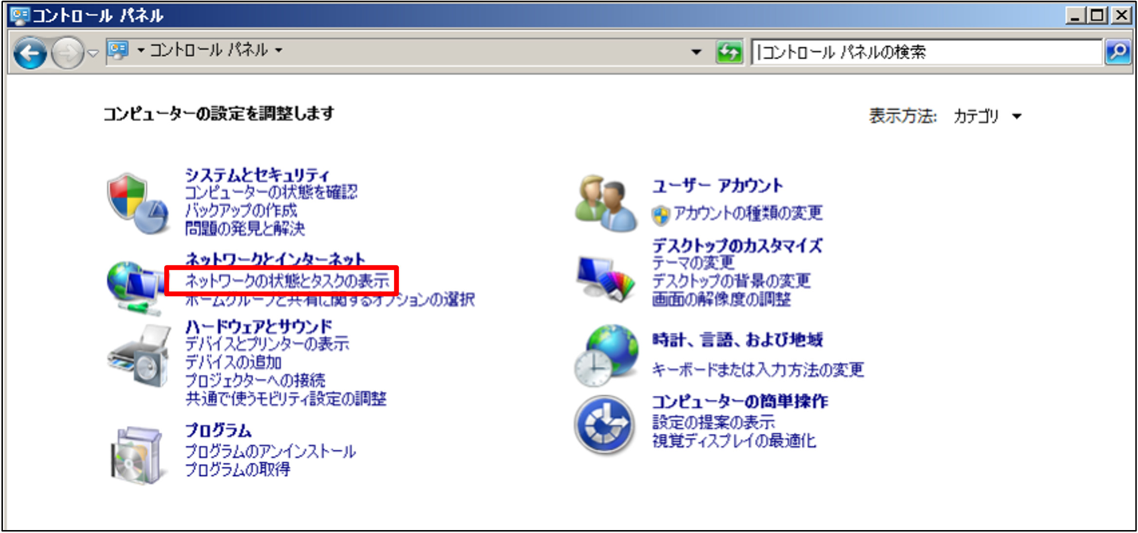 2.[ネットワークの状態とタスクの表示]をクリックします。