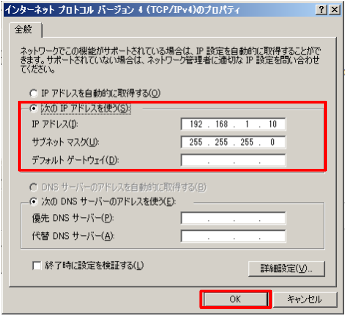 6.[次のIPアドレスを使う]を選択し、下記情報の入力後[OK]をクリックします。