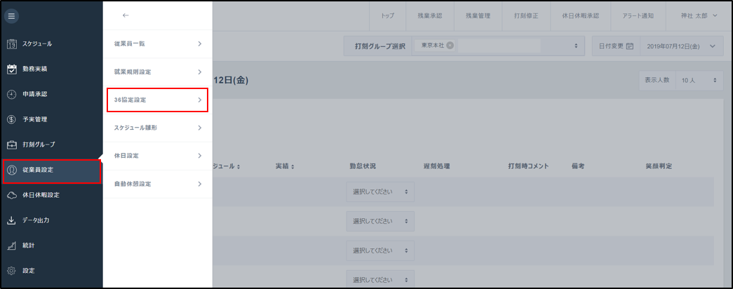 1.[従業員設定]>[36協定設定]をクリックします。