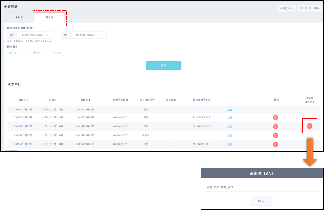 3.[承認者コメント]欄の[吹き出しマーク]をクリックすると、入力したコメントを閲覧できます。